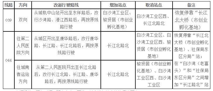 据介绍,此次调整的主要原因是长江路已完工,为方便市民出行,从1月8日起,公共汽车001路等8条公交线路恢复原线行驶。同时,受东祥路下穿隧道,长江北路无法左转东祥路的影响,039、044路线改道行驶。