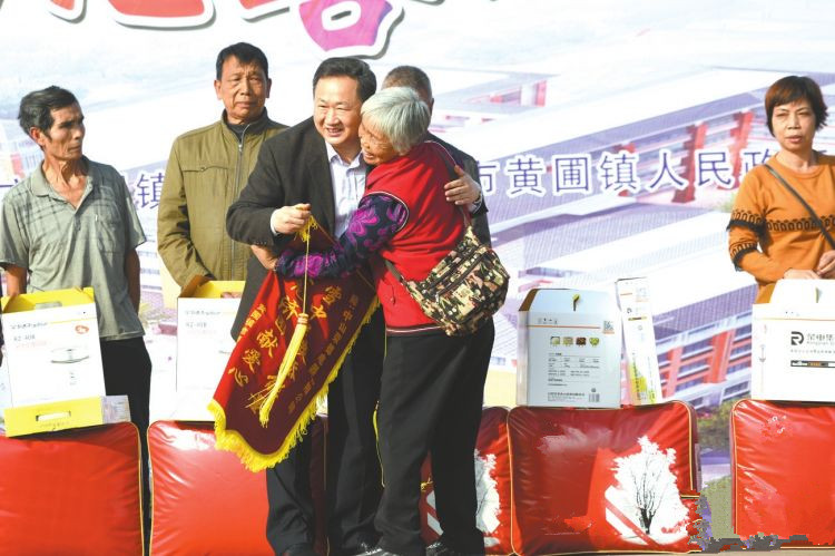 赠送锦旗仪式中,67岁的低保户龙桂珍主动和捐赠电器的企业家拥抱,表达谢意。一个简单的拥抱,代表的了龙桂珍的千言万语。“我想通过拥抱,真心感谢社会对我家的帮助。”