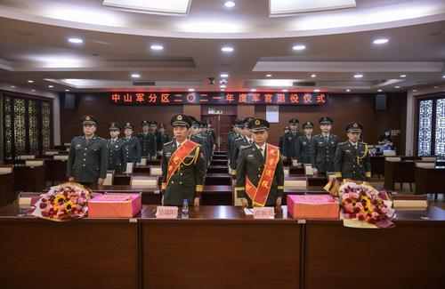 “全体起立,迎军旗,向军旗敬礼!”8月11日下午5时,中山军分区六楼会议室内,举行了简单而隆重的2021年度军官退役仪式。伴随着嘹亮的口号声,三名护旗手护卫着鲜红神圣的军旗,迈着铿锵有力的步伐迎面走来。身披殷红绶带的两名退役军官军容严整、军姿挺拔,面向军旗举起右手庄严敬礼。中山军分区司令员李云涛、中山军分区政委刘灿莹出席仪式。