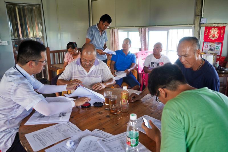 农棚内,简单的一张木桌前围坐好几人,几家水产养殖户正三三两两讨论着,商量签订保险前的最后一些细节。“他们都是华山围西部这一片的,听到消息就都来了。”南朗供销社主任甘燕玲说。